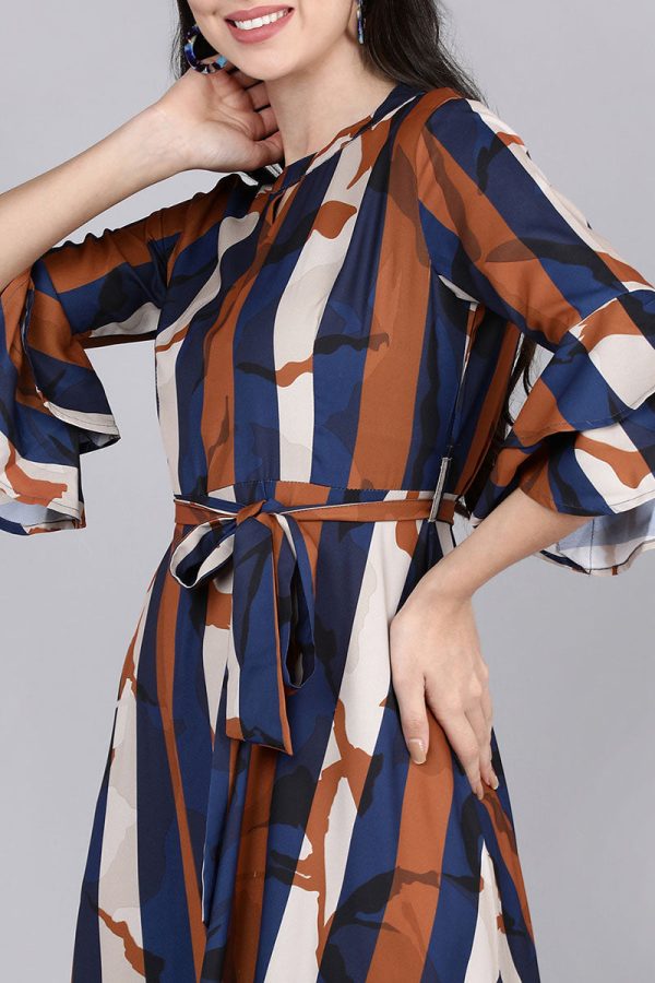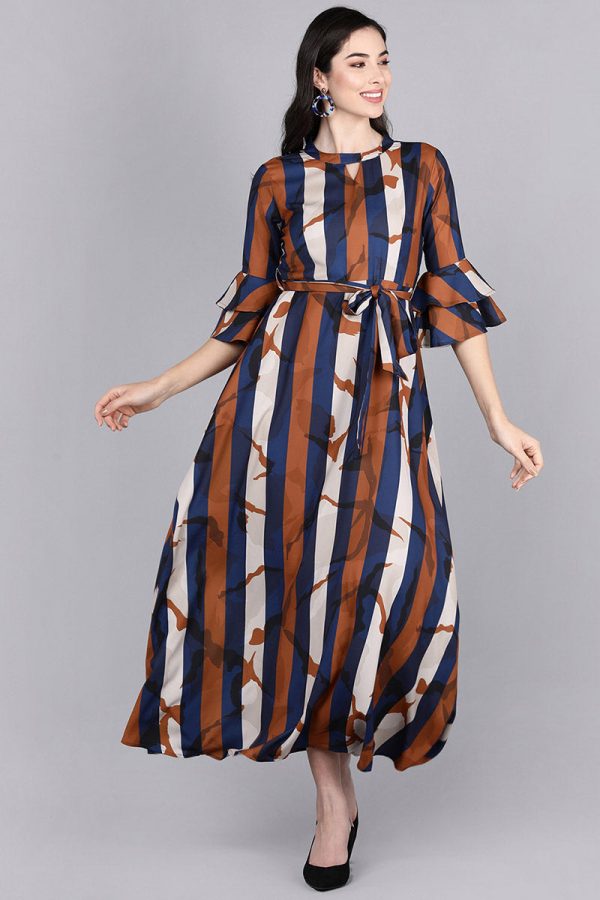 Multicolor Polyester Striped Flared Maxi Dress Elevate your wardrobe with this Brown Striped Striped Dress from Ahika. It is a must-have for any woman’s wardrobe. This maxi dress features a mandarin collar, three-quarter sleeves with bell sleeves, a flared hemline, and an opaque Crepe fabric. The trendy striped pattern and classic button closure make this…