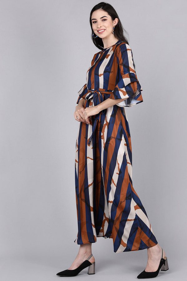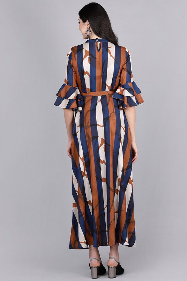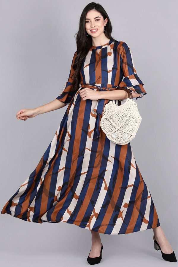 Elevate your wardrobe with this Brown Striped Striped Dress from Ahika. It is a must-have for any woman’s wardrobe. This maxi dress features a mandarin collar, three-quarter sleeves with bell sleeves, a flared hemline, and an opaque Crepe fabric.