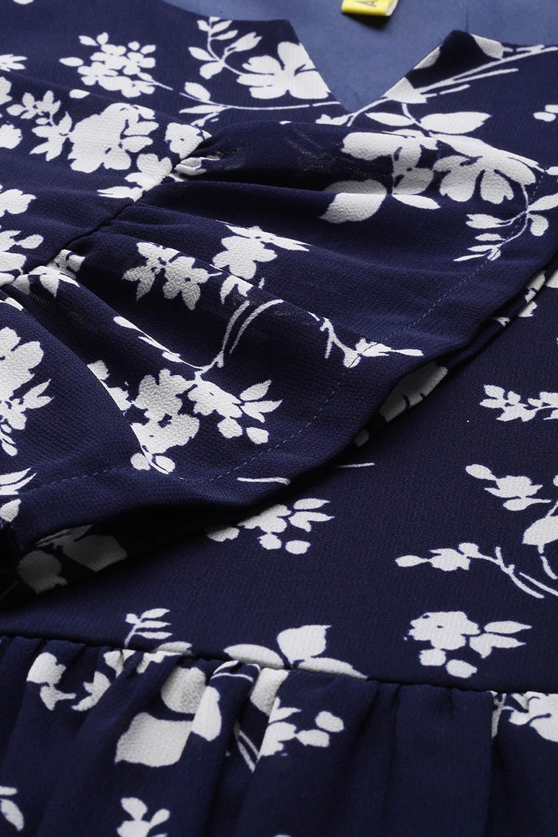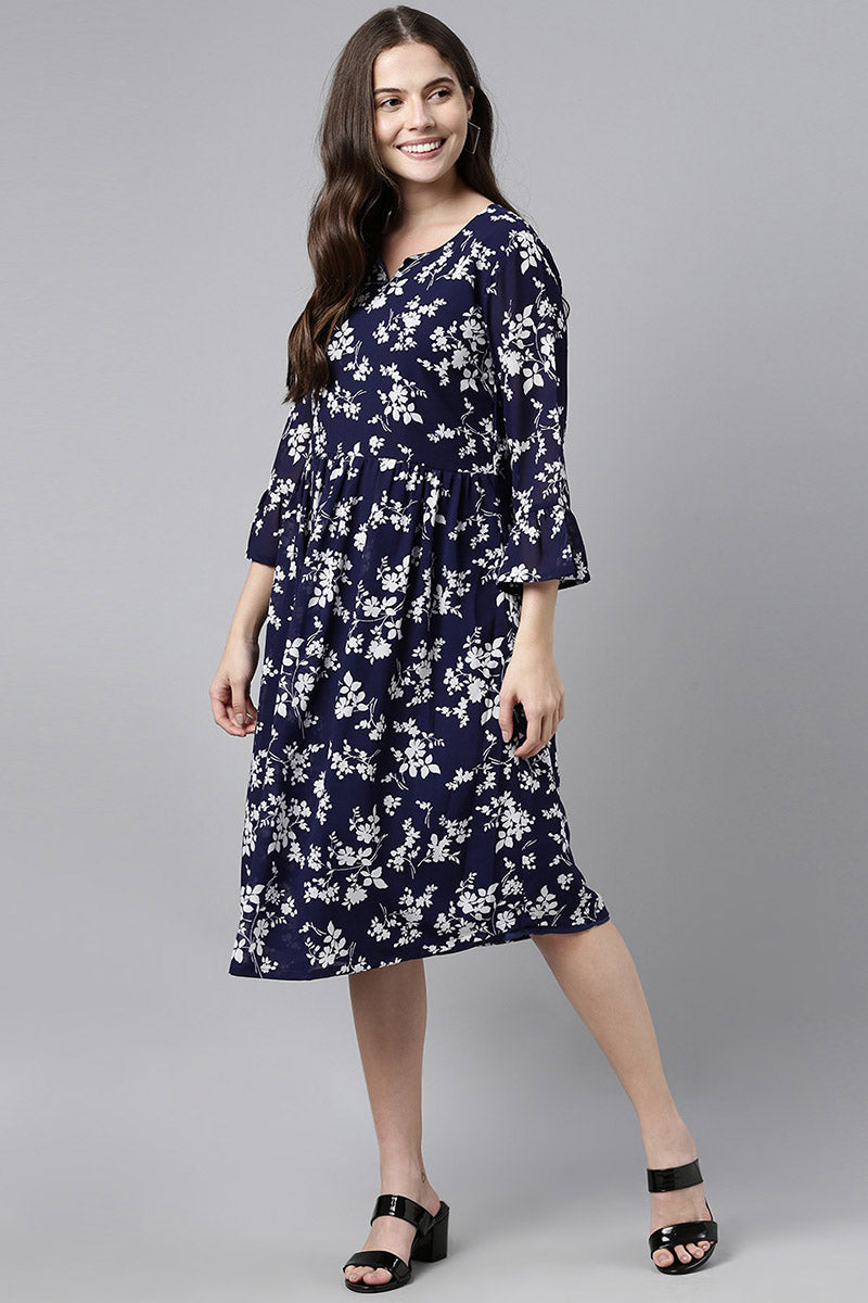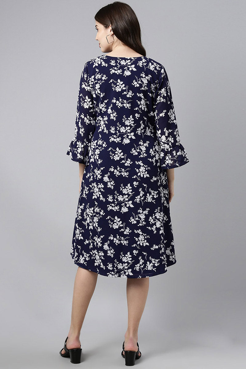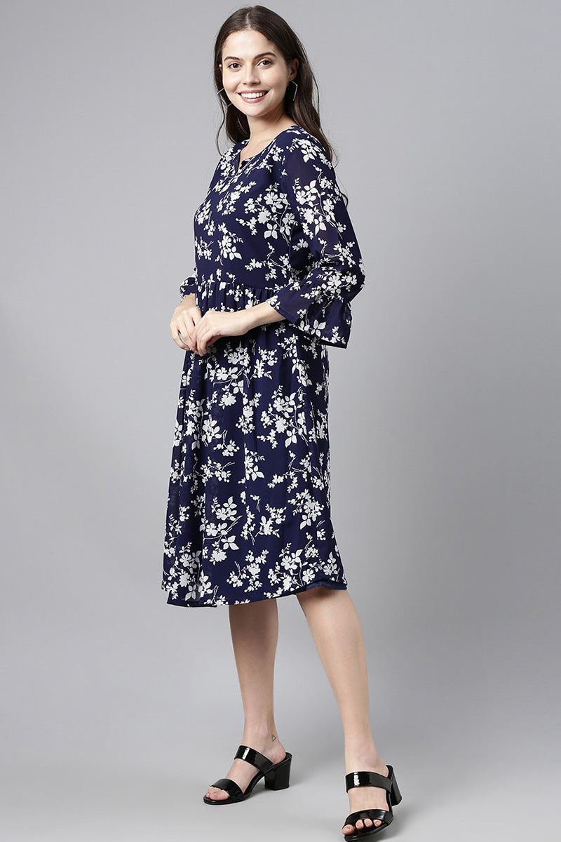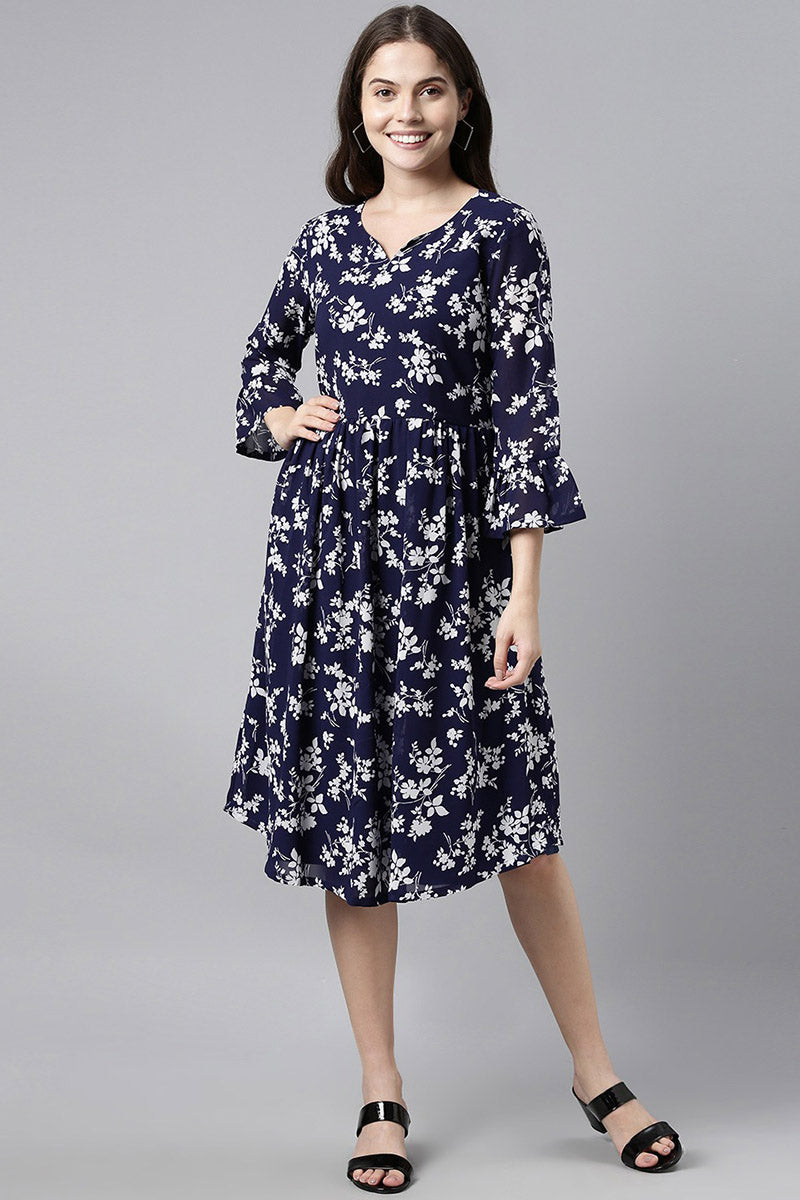 Be the talk of the town in this stunning Poly chiffon Navy Blue Floral Chiffon Dress. It is designed with a fit and flare silhouette, a v-neckline, knee length, and three-quarter sleeves with bell cuffs. The beautiful floral print and woven chiffon fabric make this dress a must-have for any wardrobe.